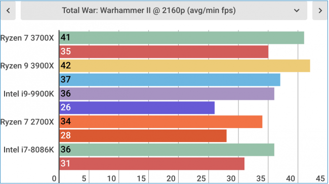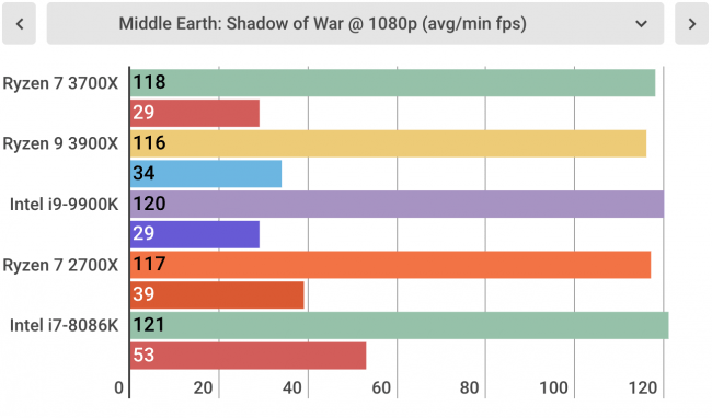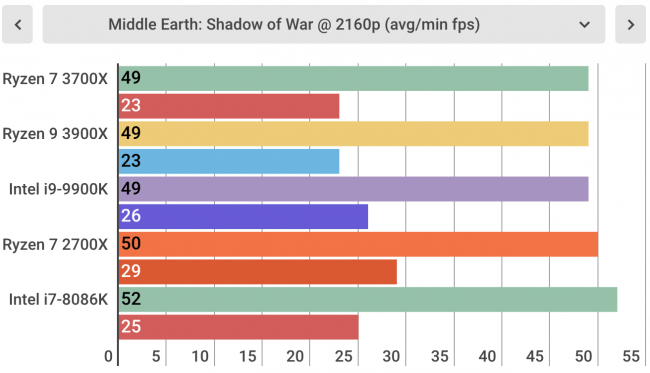 با این وجود هنگام اجرای بازیهای مختلف این پردازنده رایزن کمی ضعیفتر از همتای اینتل خودش بود. برای اجرای بازی Middle Earth: Shadow Of War با رزولوشن 4K رایزن 7 3700x فقط قادر به پردازش 118 فریم بود اما اینتل i9-9900k توانست 120 فریم را پردازش کند. البته این موضوع تفاوت در تجربه شما ایجاد نمیکند اما باز هم باعث برتری شما خواهد شد.