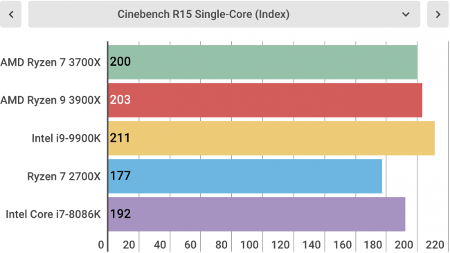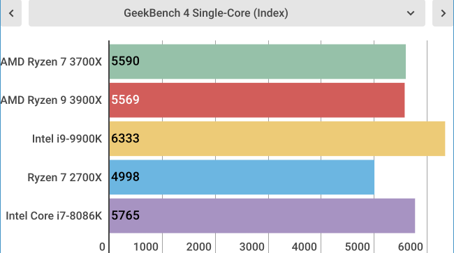 این موضوع در بنچمارکهای ما نیز کاملا مشهود است. برای مثال در Cinebench R15، پردازنده رایزن 7 3700x، 2087 امتیاز کسب کرد. در حالی که امتیاز اینتل i9-9900k فقط 1873 بود. در گیکبنچ نیز این پردازنده توانست امتیاز فوقالعادهی 34515 را به دست بیاورد که بیشتر از امتیاز 33173 اینتل i9-9900k در تست چندهستهای بود. البته در تست تک هستهای رایزن 7 3700k فقط 5590 امتیاز به دست آورد که کمتر از 6333 امتیاز اینتل 9900k بود.