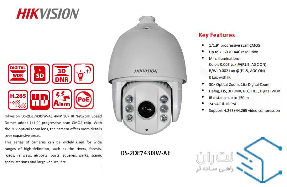 دوربین اسپید دام مدل DS-2DE7430IW-AE یک دوربین مدار بسته تحت شبکه است که از سنسور CMOS با ابعاد 1/1.9 استفاده میکند. این سنسور دارای دقت 4 مگاپیکسلی میباشد. رزولوشن تصویر خروجی در این دوربین تا 2560 * 1440 پیکسل افزایش مییابد. فیلمبرداری رنگی در این دوربین نیازمند حجم بسیار کمی از نور است به طوری که تنها در حجم 0.005 لوکس از نور میتوانید تصویر رنگی مشاهده کنید. این میزان نور را توسط نور مهتاب در شب نیز میتوانید در اختیار داشته باشید. همچنین فیلمبردای B/W در 0.002 لوکس امکانپذیر است. اما اگر از این دوربین یک محیط بسیار تاریک قصد استفاده دارید، هیچ نگران نباشید. چراکه این دوربین تا فاصله 150 متر با استفاده از قابلیت دید در شب توانایی فیلمبرداری واضح دارد.